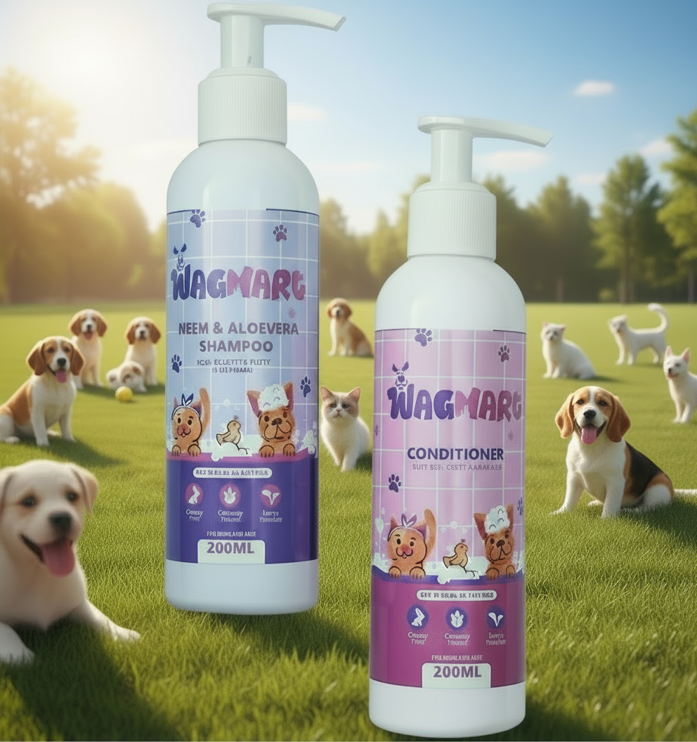 Give your furry friend the ultimate care with WagMart’s Pet Shampoo & Conditioner Combo — a perfect blend of nature, nourishment, and protection. This gentle duo combines the power of Neem, Aloe Vera, and Oatmeal with a rich mix of herbal extracts and essential oils, offering a complete cleansing and conditioning experience for dogs and cats of all breeds.