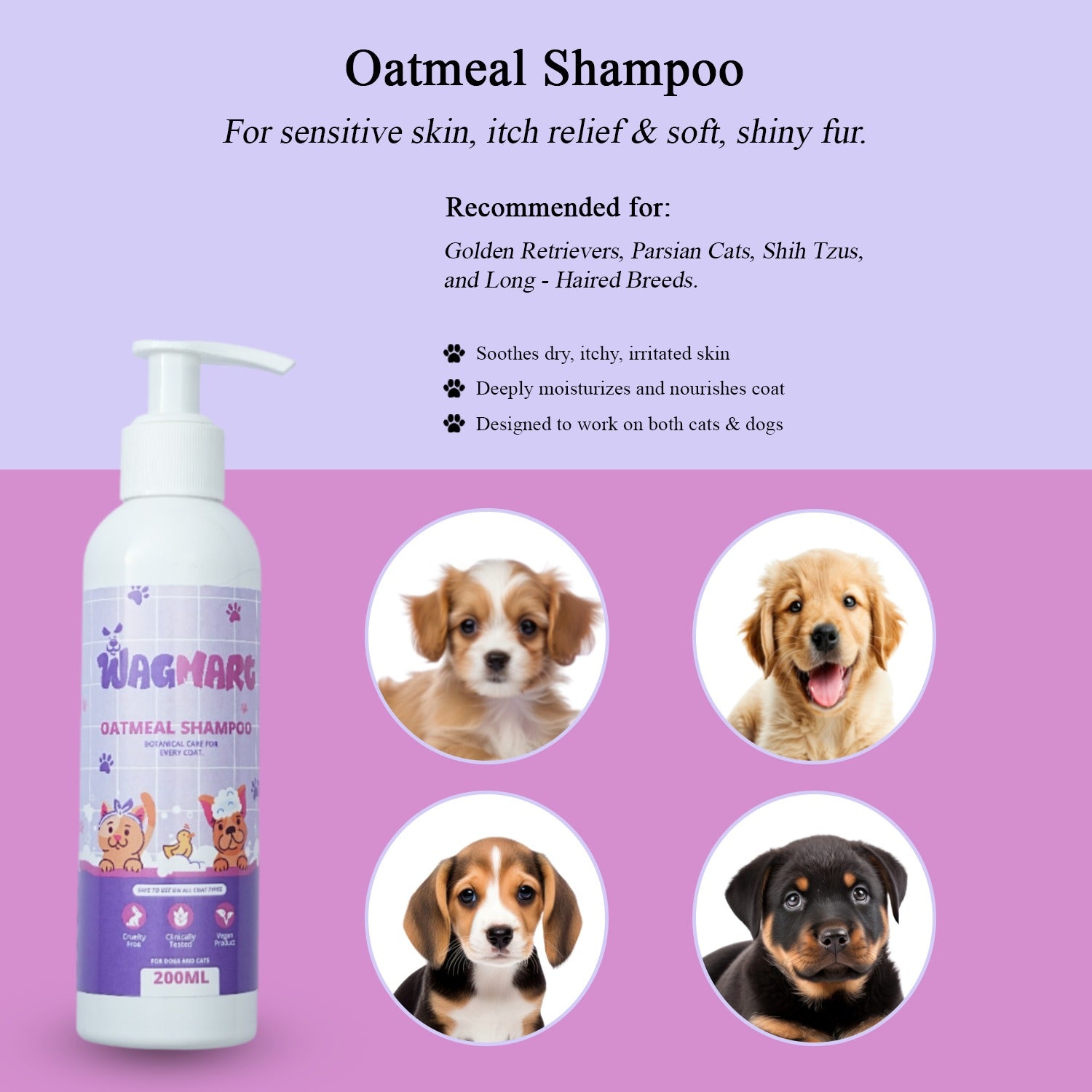 Soothe your pet’s skin naturally with WagMart Oatmeal Dog & Cat Shampoo. Crafted with organic oatmeal, coconut oil, and powerful herbal extracts, this gentle formula cleanses without stripping natural oils. Perfect for pets with dry, itchy, or sensitive skin, it restores softness, shine, and comfort—leaving your furry friend fresh, healthy, and cuddle-ready.